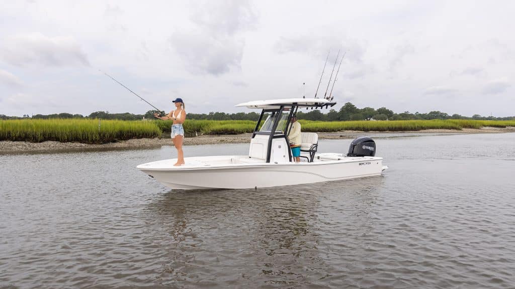 Designed to do it all, this bay boat transitions seamlessly from serious inshore fishing to laid-back days on the water. The spacious bow casting platform offers ample room to fish with ease, while integrated forward deck steps provide convenient storage for gear, fish, or PFDs. At the helm, the console features a sleek black acrylic dash with excellent visibility and generous space for a range of navigation screen sizes and layouts.