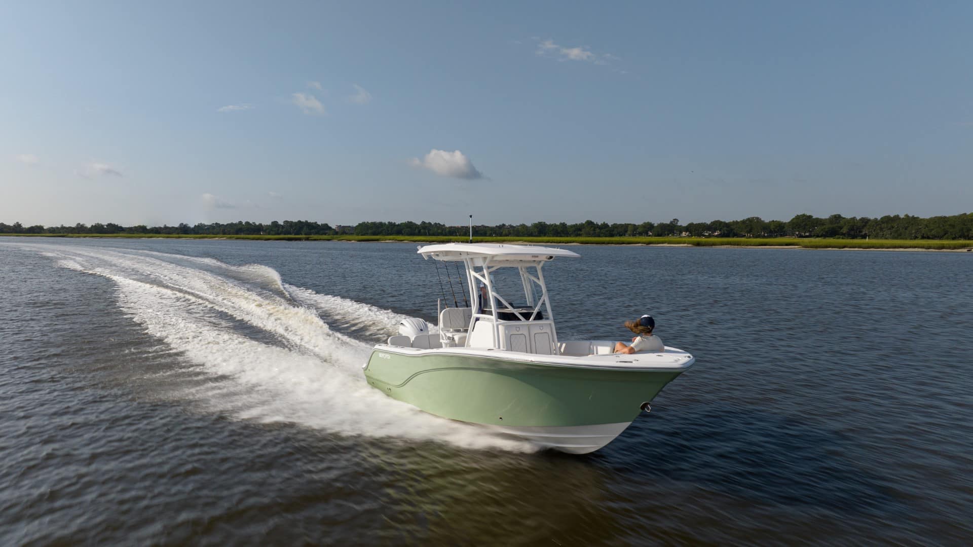 - T-Top with canvas awning, rear spreader lights, tulip rod holders (4) and LED anchor light