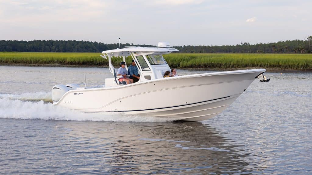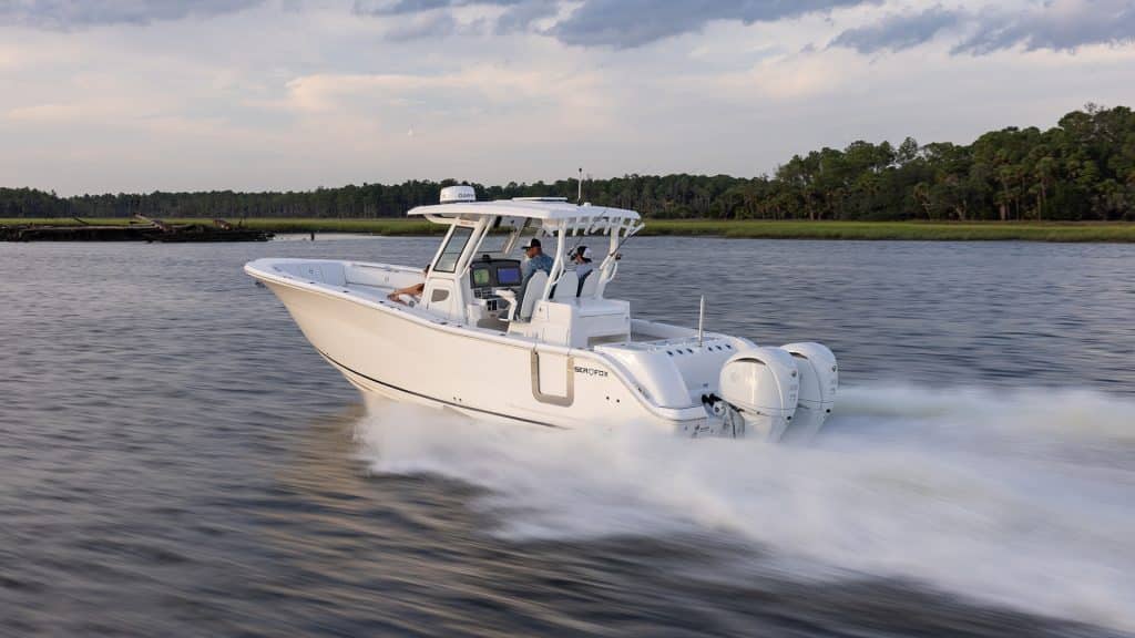 The triple helm seat offers room for three with integrated armrests for added comfort on long runs. Finished with signature Sea Fox stitching for a premium look and feel.