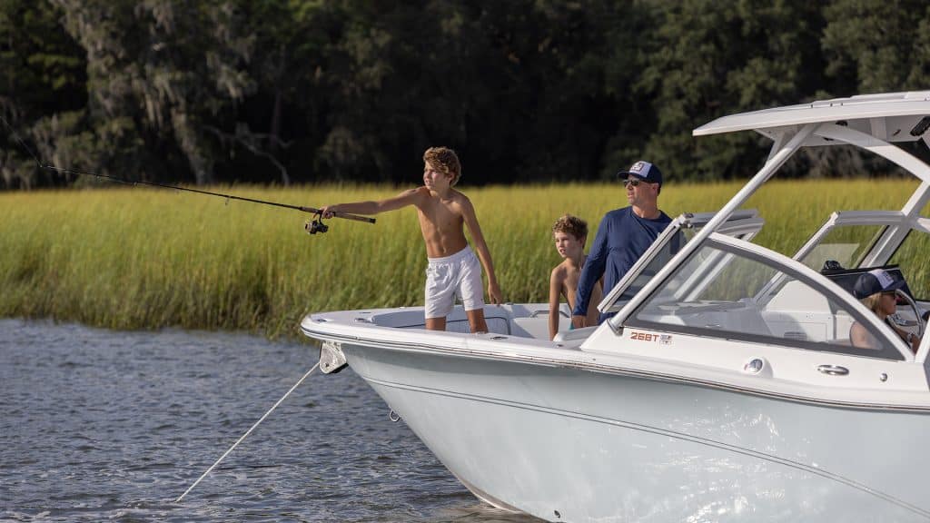 Sporty, stylish, functional and yet well appointed are all good ways to describe the 268T. We designed this boat with the multipurpose family in mind. With its generous standard features (dock door, multi-position lounge seating, oversize hardtop and integrated windshield) and available options (electric grill, aft shade, non-skid foam flooring) the 268 Traveler is sure to exceed all of your family’s expectations.